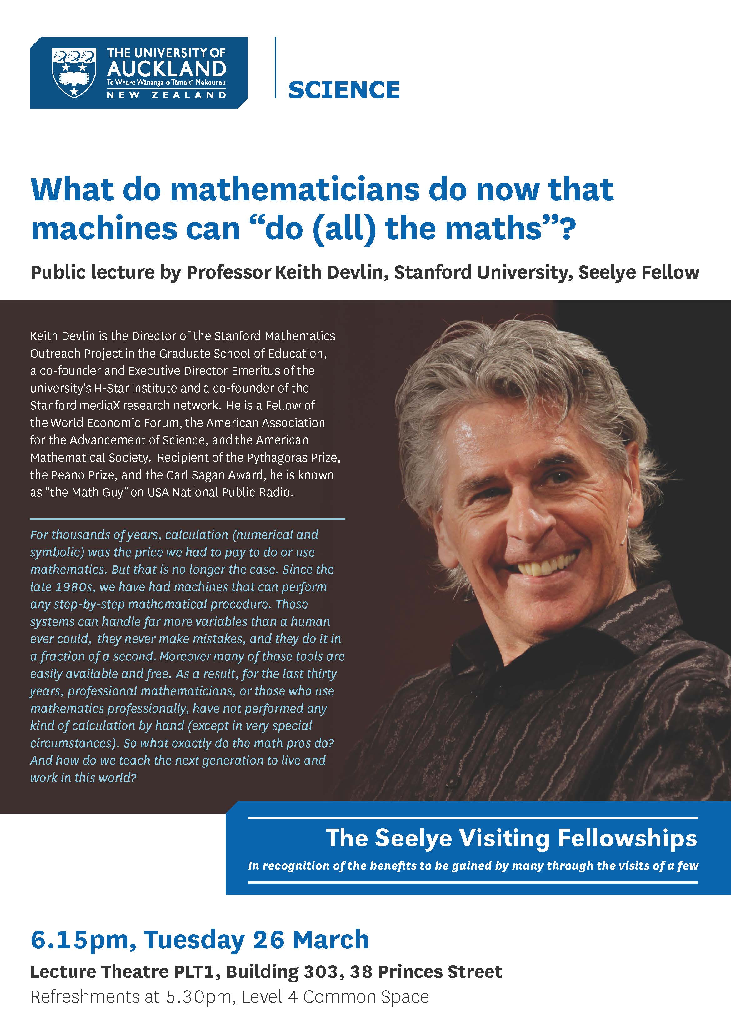 On Monday (March 18) I arrived in New Zealand for a three week visit as a Seelye Fellow in the Mathematics Department at the University of Auckland. In addition to giving some research seminars, I give a Pubic Lecture on March 26. (See flyer below for details.)