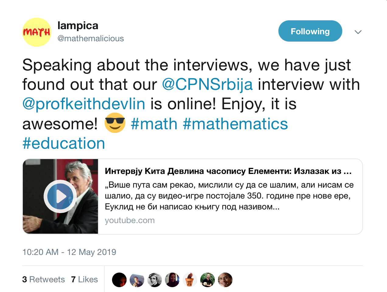 In a comprehensive interview with Aleksandar Ravas and Tijana Markovic, published in the 12th Element, Devlin spoke about mathematical thinking, mathematics education, predicting the future, the difference between false stories in mathematics and the reality, and many other interesting and socially engaged topics.”