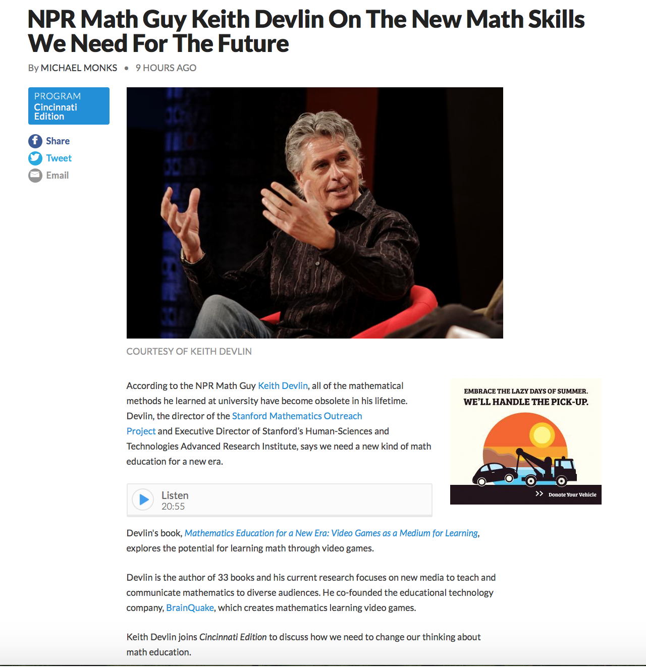 On August 19, WVXU Radio in Cincinnati interviewed my for their daily lunchtime show Cincinnati Edition. Host Michael Monks asked me about the kind of mathematics kids need to learn in schools today. The full conversation is available for streaming on the Web (21 mins) at https://www.wvxu.org/post/npr-math-guy-keith-devlin-new-math-skills-we-need-future#stream/0