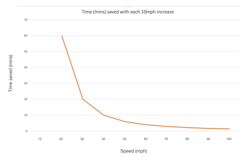 As you can see when we graph these figures, the gain in time gets progressively less as the speed increases, with the big savings coming up to 40mph and becoming essentially irrelevant above 70mph.