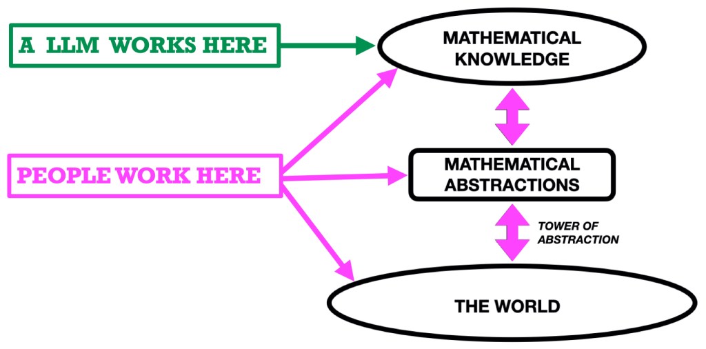 Mathematicians work with abstractions they understand, and in doing so realize what they are doing and have an awareness of how those abstractions relate to one another and to the world. The thick, vertical purple arrows indicate that tacit knowledge. By contrast, an LLM works purely with letters of the alphabet.